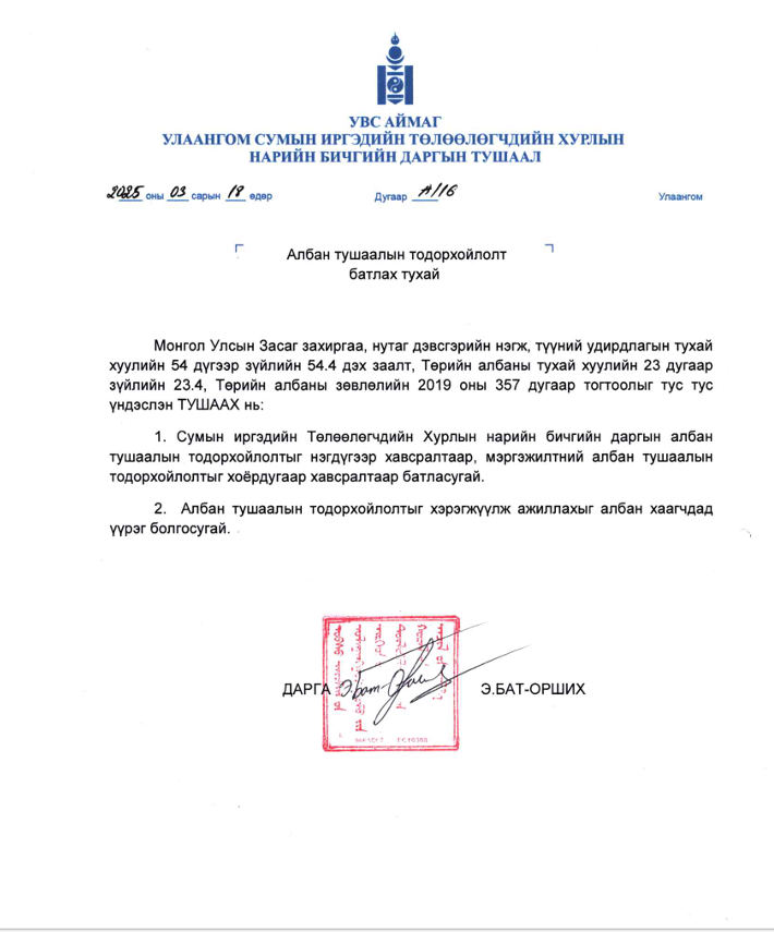 Албан тушаал: Увс, Улаангом сумын ИТХ-ын Нарийн бичгийн дарга Э.Бат-Орших